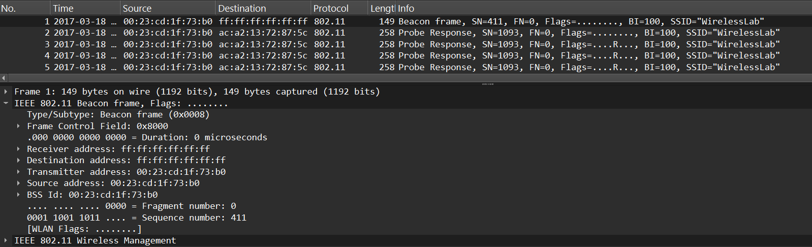 Opening the provided pcap file shows that it captures network traffic related to the 802.11 protocol. ** IEEE 802.11** is the standard that defines how Wi-Fi operates at the Physical (PHY) layer and the Data Link (MAC) layer.