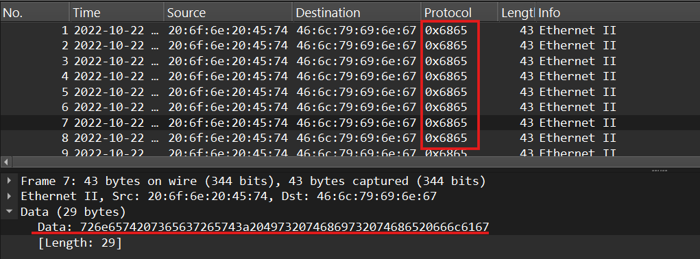Packets 1-9 have a custom Protocol ID of 0x6865, and their Data fields contain numeric sequences.