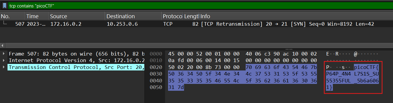 After opening the pcap file in Wireshark and considering the hint hide and seek, I searched for the flag using the filter tcp contains "picoCTF".