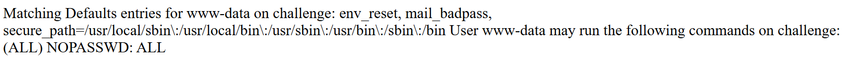The output indicated that www-data can execute commands as root without a password.