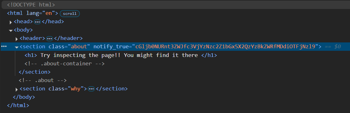 Inspecting the page's source code reveals an unusual attribute notify_true="cGljb0NURnt3ZWJfc3VjYzNzc2Z1bGx5X2QzYzBkZWRfMDdiOTFjNzl9" within a <section> element.