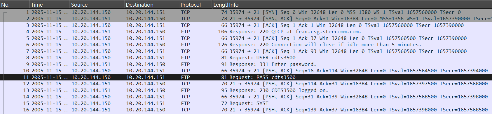The provided pcap file captures an FTP connection between 10.20.144.150 and 10.20.144.151.