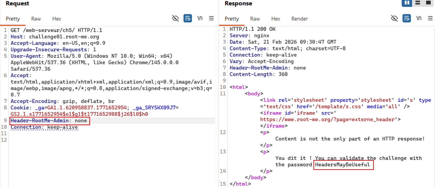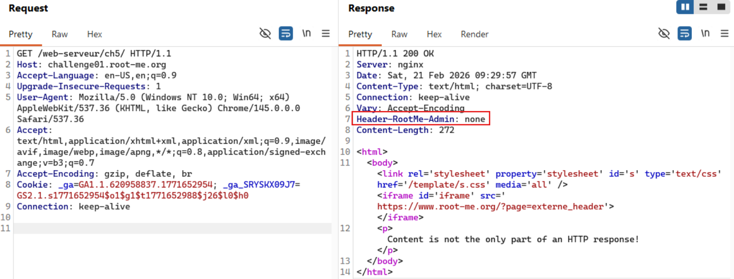 By inspecting the HTTP response headers from the initial request, we can observe a custom header named Header-RootMe-Admin: none.
