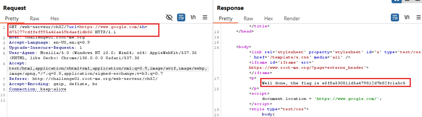 As expected, the server accepted the hash and successfully redirected to Google. This confirmed the vulnerability, and I was able to obtain the flag.