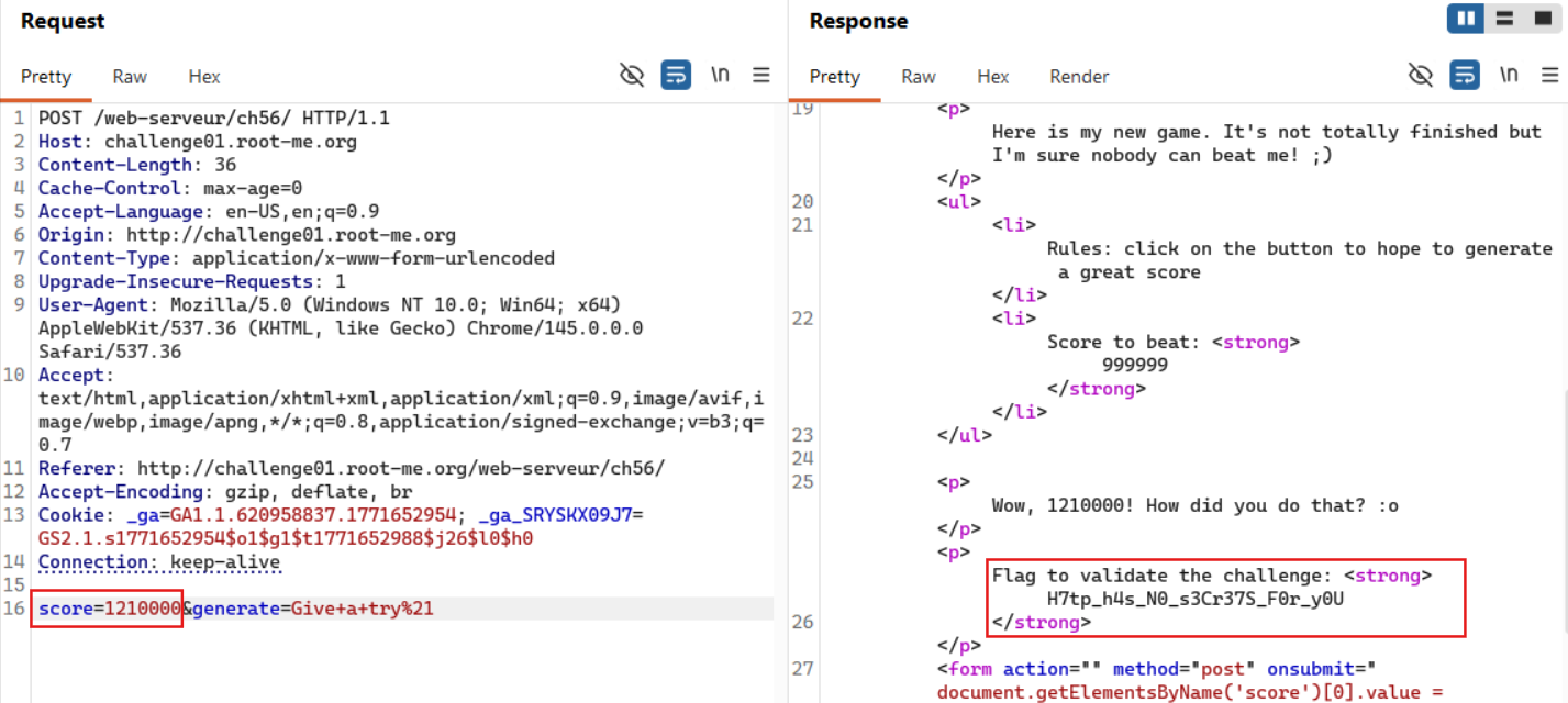 The solution is straightforward: intercept and modify the request using Burp Suite, and change the score parameter to any value greater than 999999.