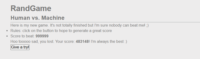 The challenge provides a website featuring a simple game between a human and a machine. When clicking the "Give a try" button, the application automatically generates a number, and to win the game, our number must be greater than 999999.