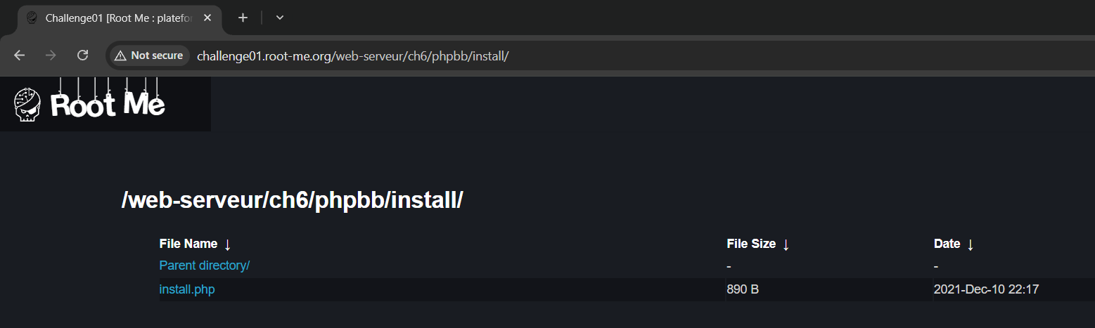 Following that lead, we navigated to /web-serveur/ch6/phpbb/install/, where we found an index.php file.