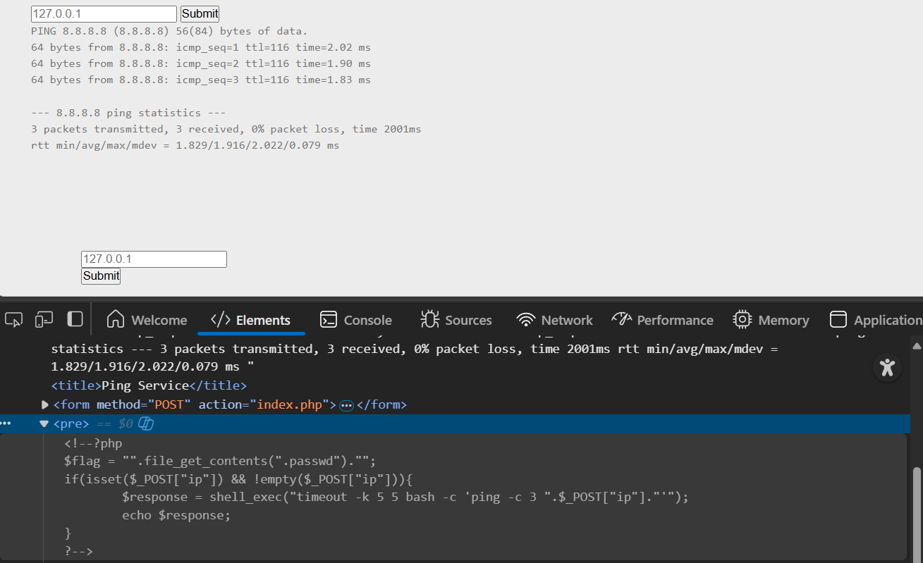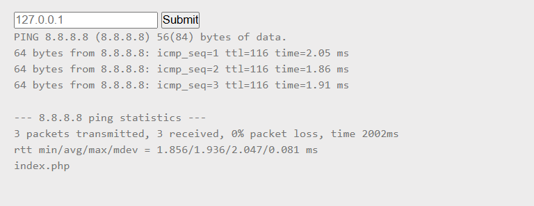 By submitting 8.8.8.8; ls, the response revealed the presence of a file named index.php, indicating that command injection is possible.