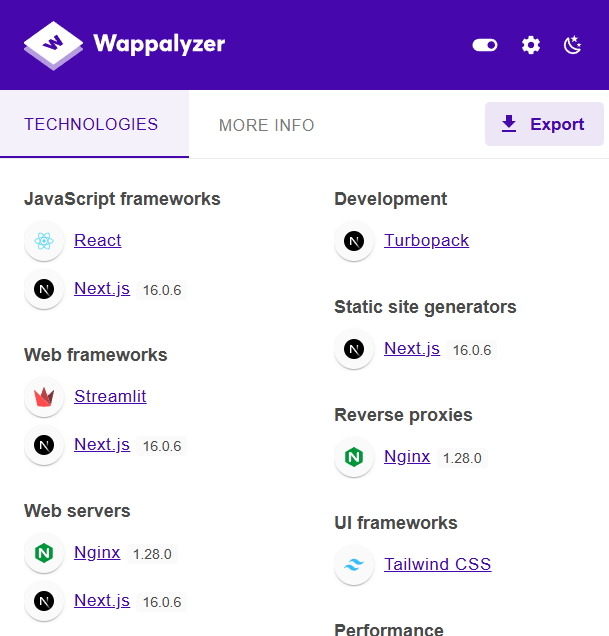 A convenient and quick method is to use the Wappalyzer browser extension. The results reveal that the competition website employs several notable technologies: