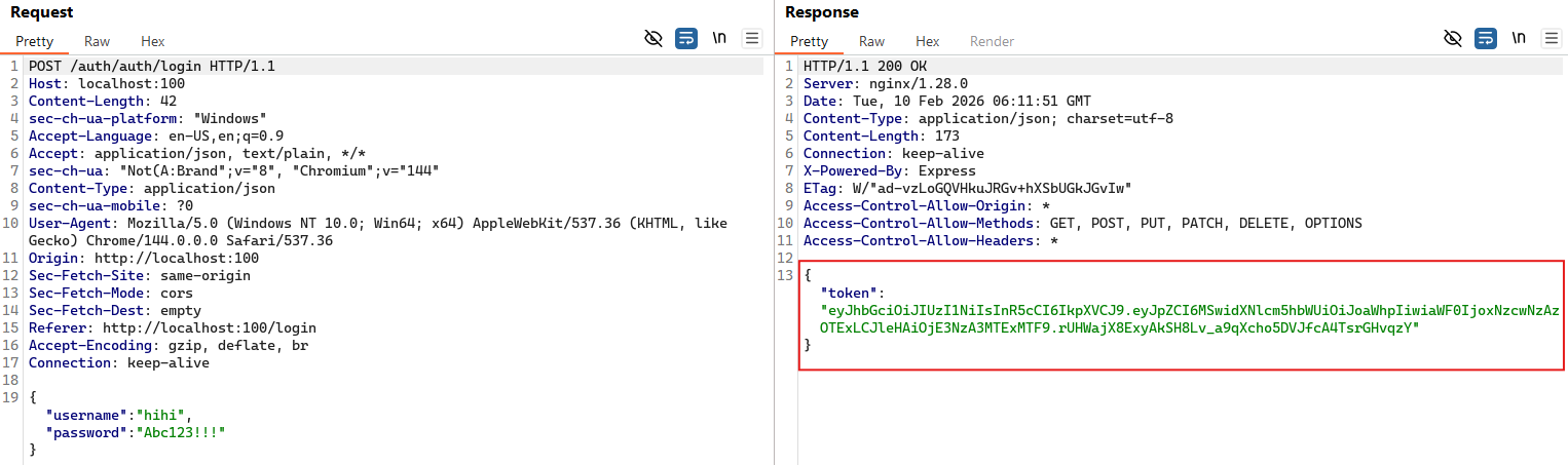 By combining the analysis of these two endpoints, we can chain SSRF and command injection. First, we log in to obtain a JWT token. This token also appears in the request headers when updating the avatar.