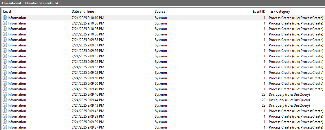 Applications and Services Logs>Microsoft>Windows>Sysmon>Operational - Ensure logs are being generated and Sysmon is running properly.